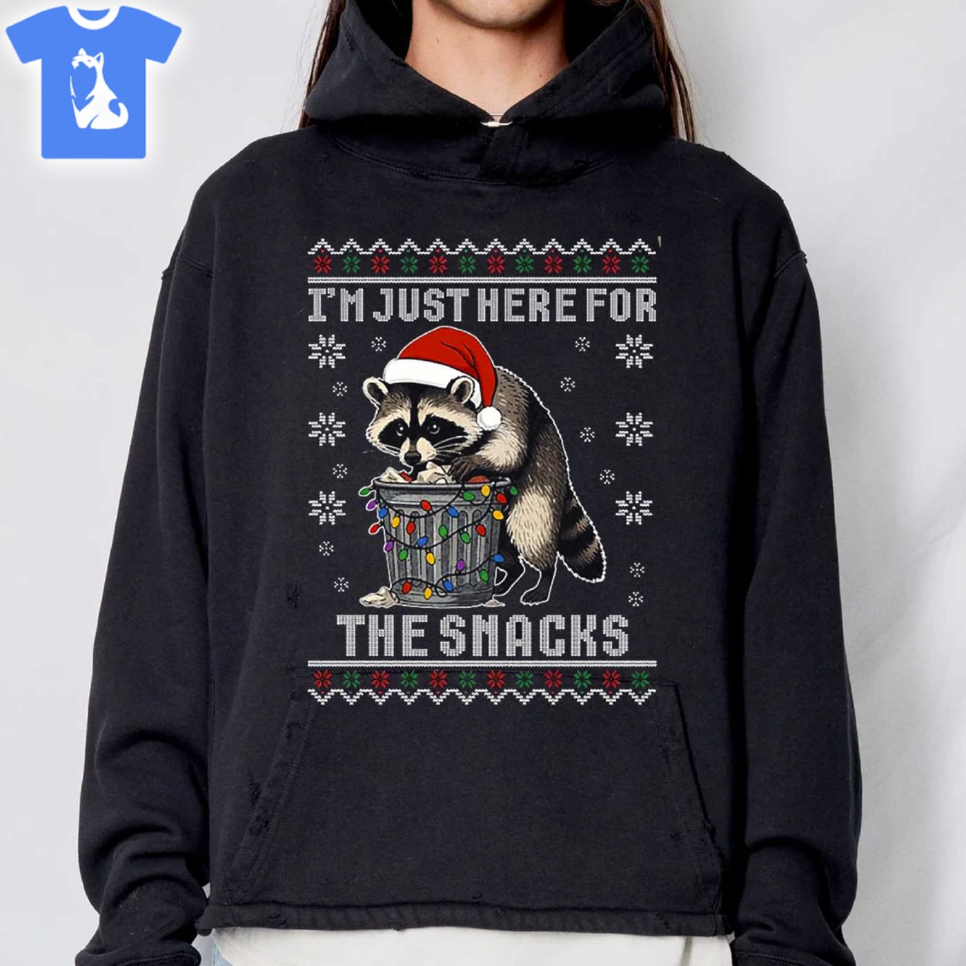 Raccoon I’m Just Here For The Snacks Ugly Christmas Sweater Long Sleeve Hoodie Sweatshirt Ladies Tees