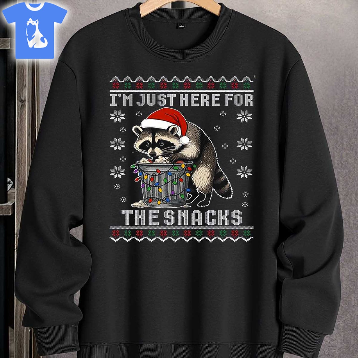 Raccoon I’m Just Here For The Snacks Ugly Christmas Sweater Information