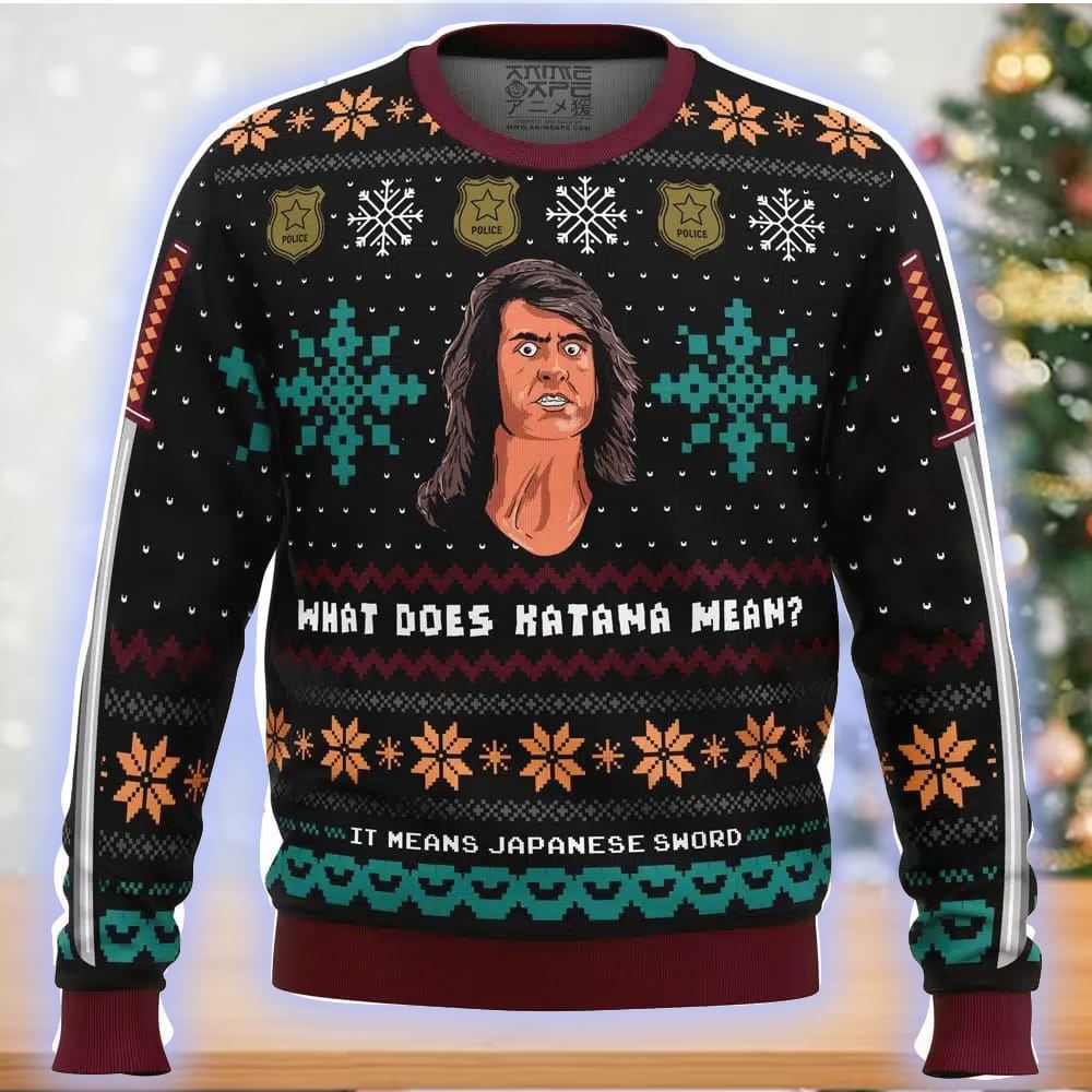 What Does Katana Mean – Samurai Cop Ugly Christmas Sweater: A Samurai’s Festive Adventure!Embark on a samurai’s festive adventure with the “What Does Katana Mean – Samurai Cop” Ugly Christmas Sweater. This sweater features elements from the cult classic action film, adding a touch of cheesy charm to your holiday celebrations. Whether you’re a fan of so-bad-it’s-good cinema or simply appreciate a good laugh, this sweater is a must for a season of martial arts mayhem.